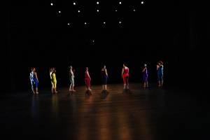 Universe is our final piece--a bright and cheerful celebration of the universe. The first section is a solo in which the dancer moves in a very small space. We are trying to show that the universe is so vast, it can be a lonely place. Imagine if you lived alone on the International Space Station for months on end. Would you get lonely? In the second section, all the dancers join the dance and bound around the stage. Each dancer has her own choreography to remember. There are moments when everyone comes together and moments where everyone is doing something different. Just like in the universe, all of these elements come together to make one beautiful and excitement-filled vision. The dancers try really hard not to crash into one another in this dance. This piece is also super hard. When the dancers fall to the ground at the end of the dance, you can see how hard they are breathing. The music for this piece is by the French band, Air. | Costumes are pants and shirts in a rainbow of colors. |