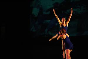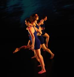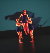 Gravity is a piece all about the theory of gravity. Before this dance, the audience hears about Sir Isaac Newton and how he discovered the force of gravity. The dancers fly across the stage, jumping and catching, falling and recovering. It is an exciting, death-defying work. The lifts in this piece are extremely complicated and the dancers have spent three months practicing together to get the timing right. One false move and someone could fall on the floor. But, don't worry. Part of being a dancer is learning how to land gracefully and without getting hurt. The music for this dance is a marimba piece called Nagoya Marimbas. | Costumes are blue leotards. |