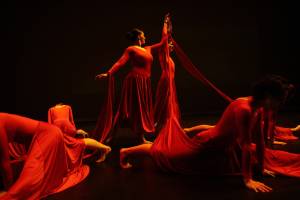 Tramonto is all about the sun. Before the dance, we talk about our closest star, including discussing solar flares and sun spots. The audience is encouraged to look for these elements in the dance. In the first section the dancers are connected together by red fabric, dancing in and out of the center of the circle. As the dancers continue this lyrical piece, they disconnect and move throughout the performance space. They use their fabric to create spirals around themselves, arcs in space, and strong lines extending from the body. This piece was first created for a group of talented high school students who live on Bainbridge Island. While a few steps have changed since then, it's mostly the same piece! The music for this piece is from Vivaldi's The Four Seasons. | Costumes are red, flowing dresses. |